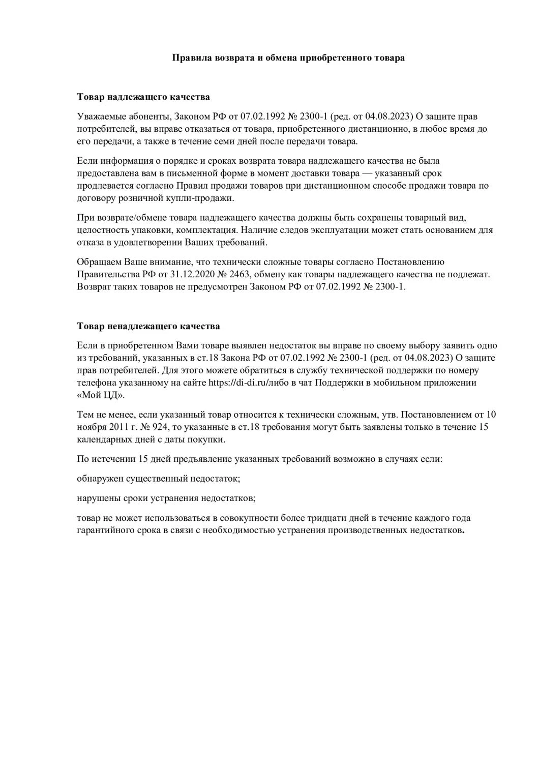 Правила возврата и обмена товара